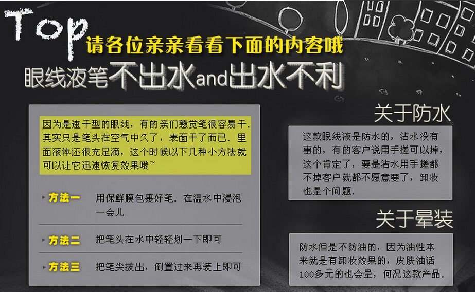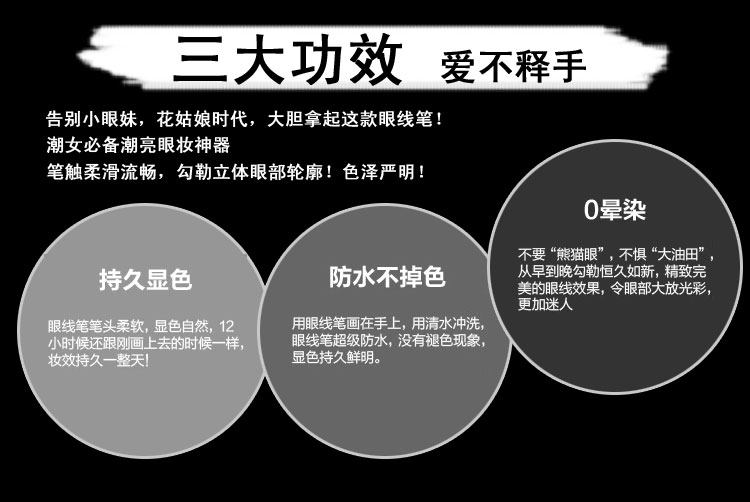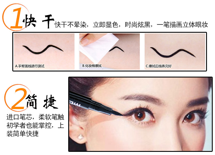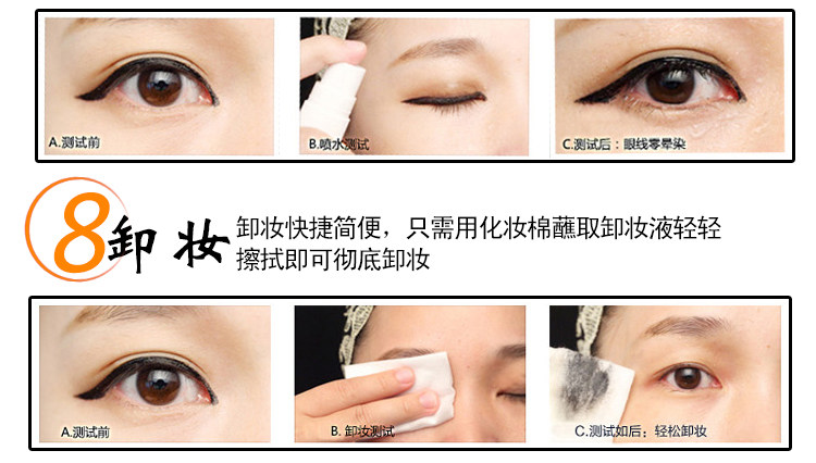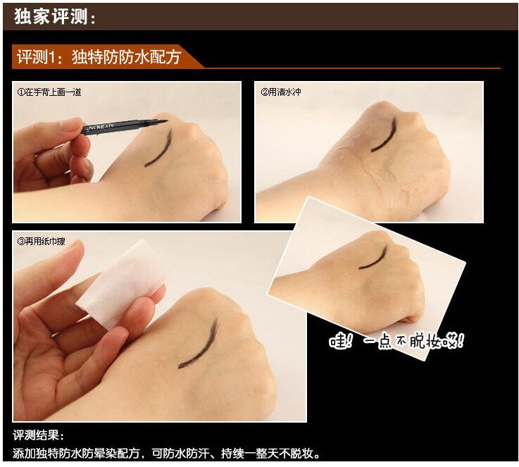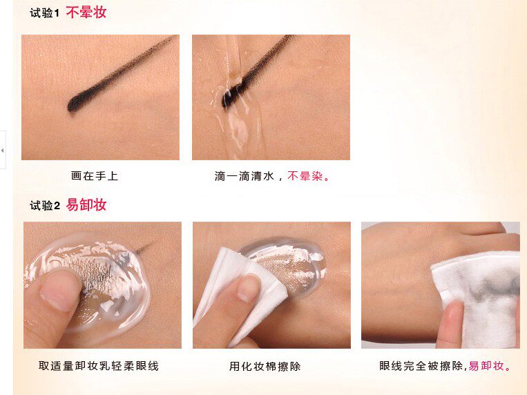本款眼线笔可保证八小时不晕染,自然的淋雨和落泪也不会花妆的(这不是油漆手搓肯定会掉,请保持良好的妆容习惯)。眼线笔是速干型,如果您化完一只眼睛感觉有点干只需轻甩就可以快速出水。)卸妆的时候用湿巾或者洗面奶都可以卸除干净,习惯给中差评的请绕道、如有问题请立即联系客服,我们会给予满意解决方案,请不要随意给中差评。