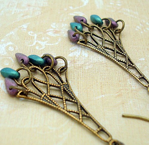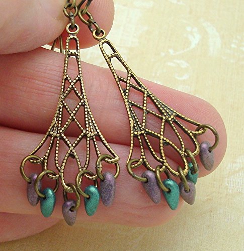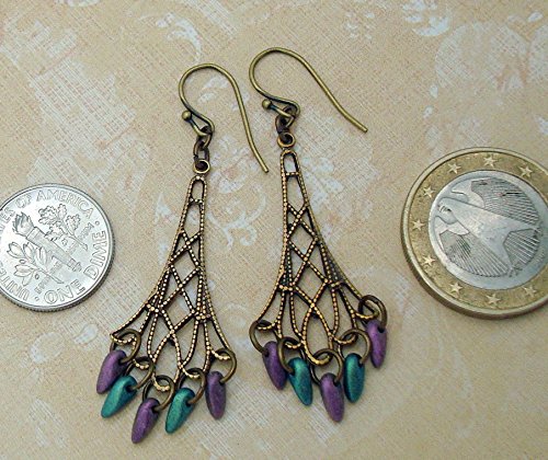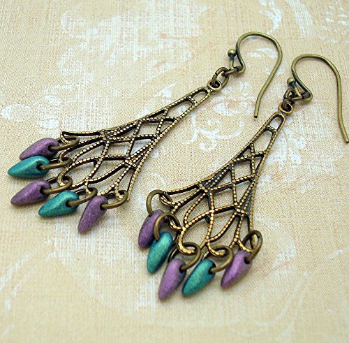 -. Title : Purple and Green Glass Spike Chandelier Earrings on Antiqued Brass
