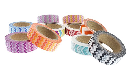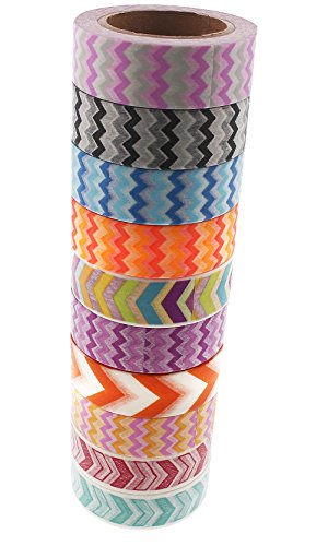 Washi Tape Set - 10-Pack Japanese Colored Adhesive Masking Tape Rolls with Cute Chevron Patterns in Assorted Colors, 0.59 Inches Wide, 32.8 Feet Long
