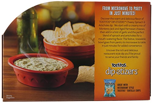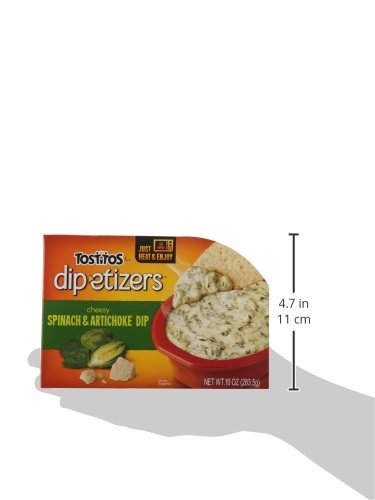 -. Feature : 10 ounce package of tostitos dip-etizers cheesy spinach and artichoke dip / Pair this dip with your favorite tostitos tortilla chips or frito lay favorites / Simple cheesy spinach and artichoke dip that is perfect for bringing to your next party / Microwaveable tray for heat and eat ease