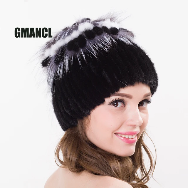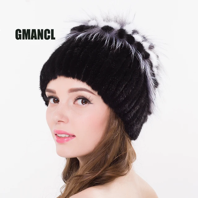 GMANCL 진짜 밍크 모피 귀 모자 여성 겨울 모자 탄성 블랙 패션 캐주얼 정품 전체 밍크 여자 Skullies & 비니