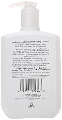 -. Binding : Health and Beauty -. Brand : Neutrogena -. EAN : 0070501872963 -. Feature : Creamy formula / Non-comedogenic / Dermatologist developed for even the most dry and sensitive skin / Leaves skin feeling moisturized as it cleanses -. Label : Johnson & Johnson SLC -. Manufacturer : Johnson & Johnson SLC -. NumberOfItems : 1 -. PackageQuantity : 1 -. ProductGroup : Pantry -. ProductTypeName : BEAUTY -. Publisher : Johnson & Johnson SLC -. ReleaseDate : 2015-07-09 -. Studio : Johnson & Johnson SLC -. Title : Neutrogena Ultra Gentle Hydrating Cleanser, 12 Fluid Ounce -. UPC : 070501872963
