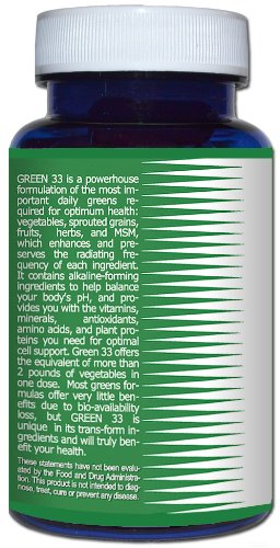 Studio : 4 Organics Publisher : 4 Organics Binding : Health and Beauty Product Description GREEN 33 is the result of advances in extraction and preparation technology that allows the significant capture of bio-availability of the most important daily vegetable greens and grains required for optimum health. GREEN 33 is a powerful formulation of 33 green vegetables, sprouted grains, herbs, antioxidants, and MSM (which enhances and preserves the radiating frequency of each ingredient.) It contains alkaline forming ingredients to help balance your body's pH, while providing you with the vitamins, minerals, antioxidants, amino acids, and plant proteins you need for cell support. Green 33 offers the equivalent of 2 and a half pounds of vegetables and herbs in one dose and will feed your body's cells the nutrients they need to flourish and provide optimal health. Most greens formulas offer very little real benefit due to bio-availability loss, but GREEN 33 is unique in its use of trans form ingredients, MSM, and plant enzymes, and will actually benefit your health. 0