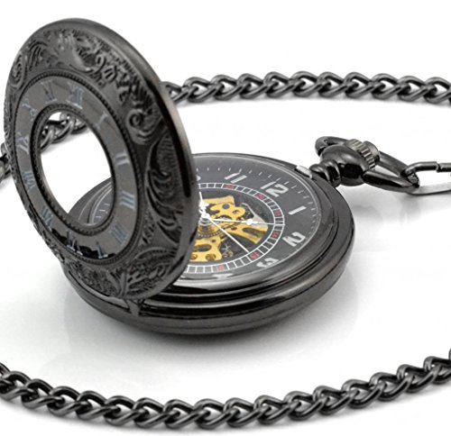 -. Title : Infinite U Cool Black Secret Roman Numerals Hollow Skeleton Steel Mechanical Movement Pocket Watch