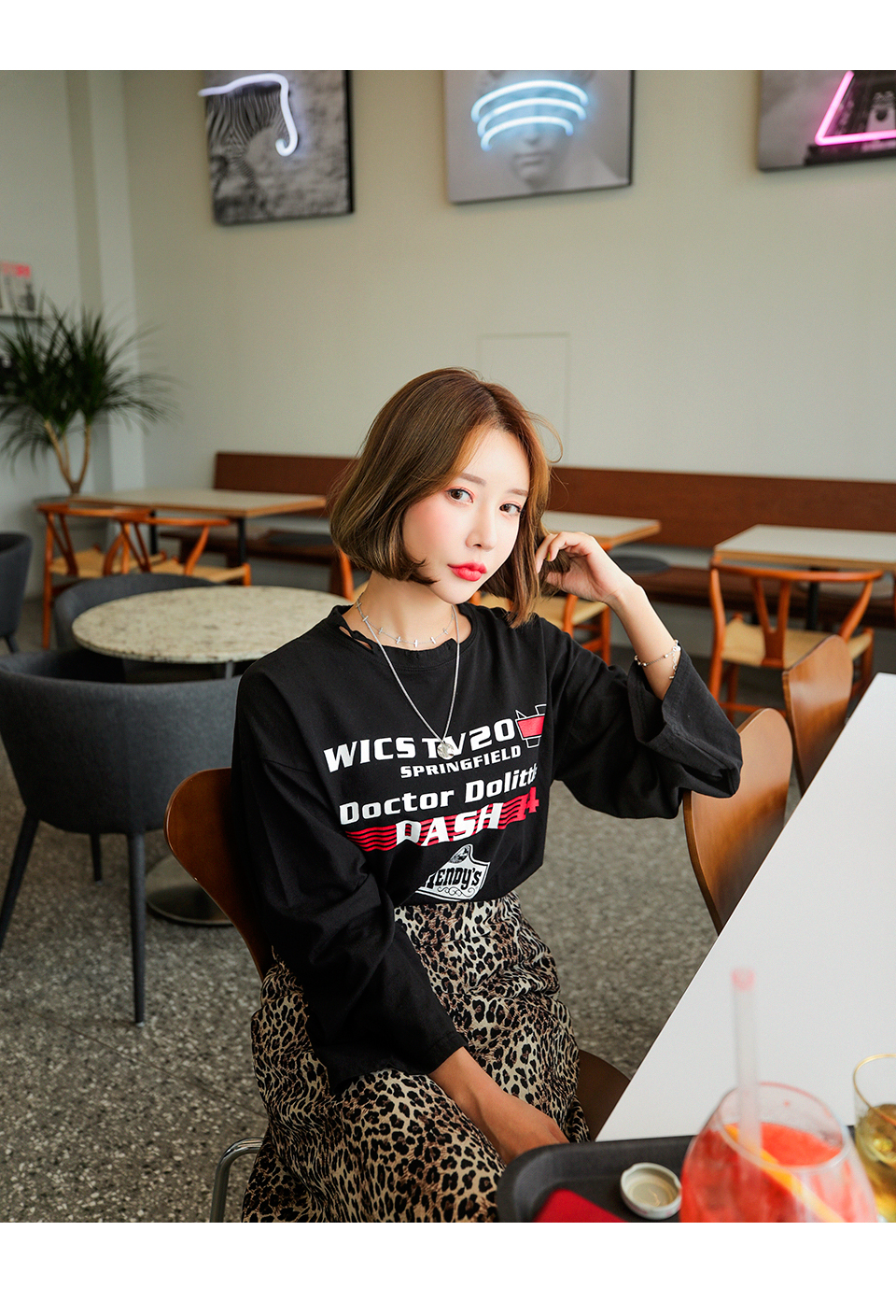 빈티지한 넥 디테일과 트렌디한 나염이 매력적인 티셔츠에요!