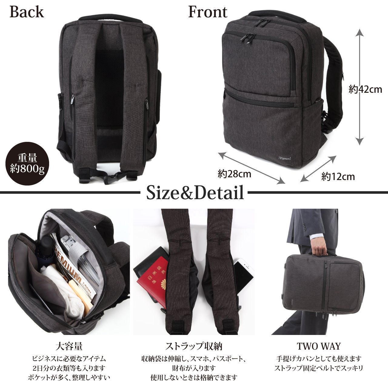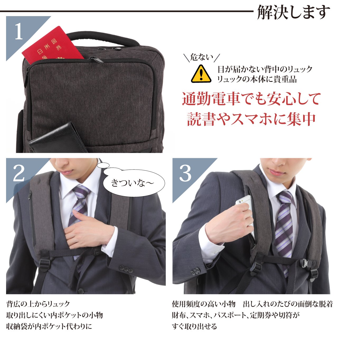 Train commuter rucksack users started to solve the problem, this product sticks to the shape and size suitable for commuting and business use.