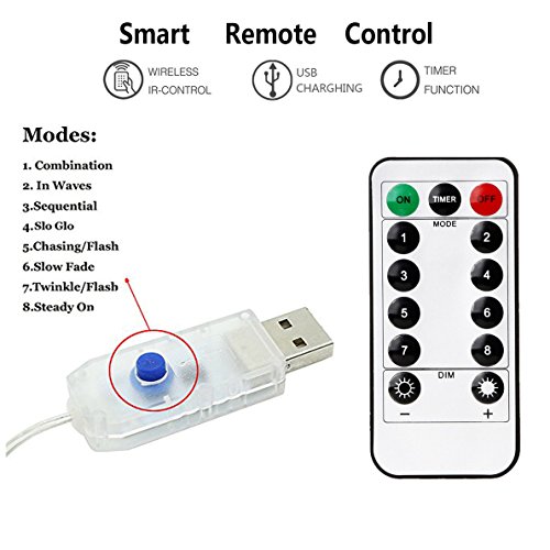 - TIMER AND DIMMABLE WITH REMOTE: Use the 13 keys remote control for easily operation. Timer function let the rope lights on for 6 hours and off for 18 hours daily. You can also adjust the brightness or switch between 8 lighting modes: Combination, In wave, Sequential, Slo glo, Chasing/Flash, Slow fade, Twinkle/Flash, Steady On.