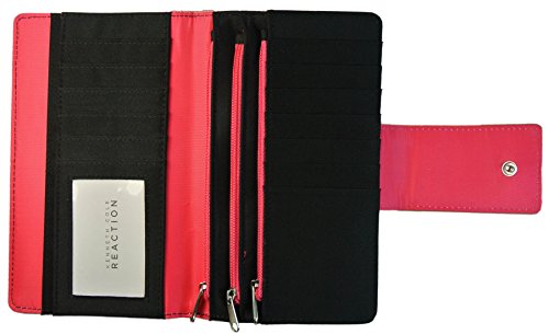 The wallet closes with a top tab and has 2 snaps so you can adjust as your wallet grows. The interior is boldly colored hot pink and black and inside you'll find 3 cash/coupon pockets, 3 large zipper pockets, 12 credit card slots and an ID window.