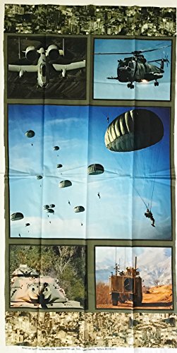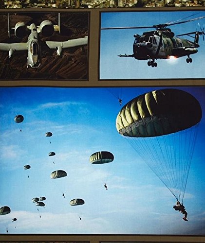 - Features: a Large Block (21.5" Wide X 18" Tall) Military Persons Parachuting Scene and a U.S. Military Fighting Jet, a Helicopter, a Tank & Other Equipment