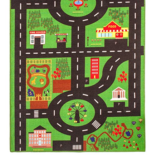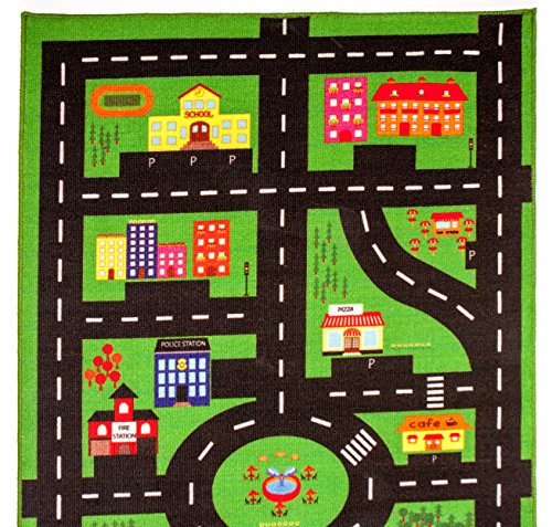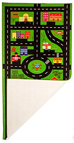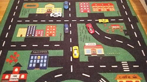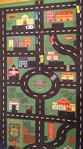 Studio : SKR Publisher : SKR Product Description Extra large 79 x 39 Inches City Play Rug Streets 10 cm wide, perfect for miniature Hot Wheels and Matchbox cars Detailed brightly colored Play Mat Includes: School, Supermarket, Restaurant, Hospital, Police Station, Fire Station, Gas Station, Garage, Zoo, Park and more. Good quality polyester blend fabric, Latex rubber anti skid back Folds or rolls up nicely and easily for storage. Washable 0