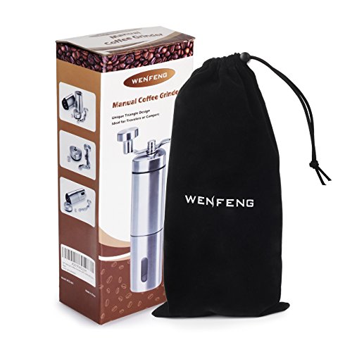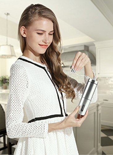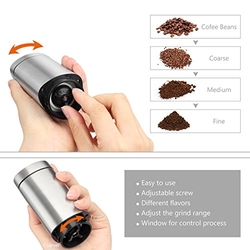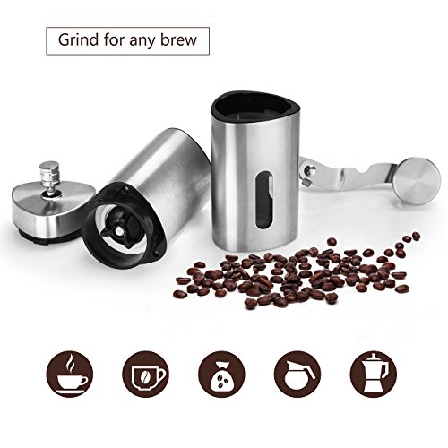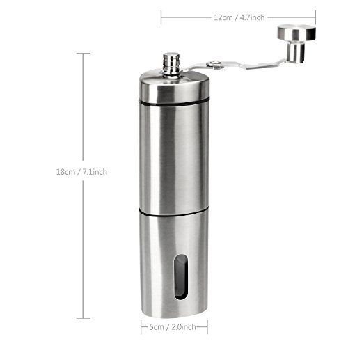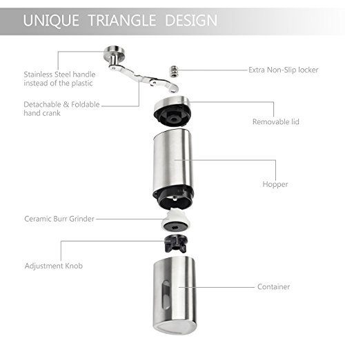 Enjoy the Fresh Coffee in the Morning The manual coffee grinder features a convenient removable hand crank mechanism consistently eliminates over 90% of the noise that electric grinders produce, go ahead and grind your coffee without waking the kids or distracting your coworkers.