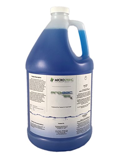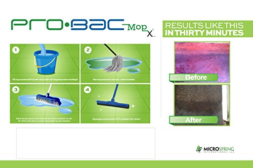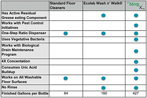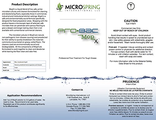 Studio : MicroSpring International, LLC Publisher : MicroSpring International, LLC Binding : Kitchen Product Description MopX naturally eliminates and prevents buildup of greasy floors resulting in eliminating the potential for slips and falls, and injury to employees. MopX works by using spore forming and vegetative bacteria to eat the grease and create a by-product of water and carbon dioxide. Directions for use: DO NOT USE HOT WATER. First time use, use a deck brush with diluted product to break up preexisting grease and let it sit for 20 minutes before mopping. When the mop bucket becomes dark brown, replace mop water with new mop water until mop water is no longer dark in color. After first time use, mop as normal during operating hours then wet mop at the end of the day. Bacteria keeps working as long as it's wet. 0