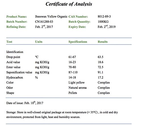 *Our all-natural organic beeswax is 100% pure. We purchase our beeswax from a wholesale certified organic supplier. When the USDA organic requirements are met, the result is a pure, natural beeswax, free of chemicals and pesticide residue. Organic beeswax is secreted by worker honeybees who feed from organic botanicals and is harvested by organic standards. Our organic beeswax is filtered to remove any impurities. Beeswax pellets are the most convenient and easy form of beeswax to use. Pellets are very easy to measure in the precise portions you'll need for many applications that use beeswax. The uniform size of the pellets will melt more quickly and evenly. When melting beeswax, use a water bath by placing a smaller pan of wax inside a larger pan of water. Organic Beeswax has many different uses, but is primarily used to manufacture Aromatherapy and natural Beeswax Candles. Other uses would include lotions, creams, body butters, and lip balms.Feature