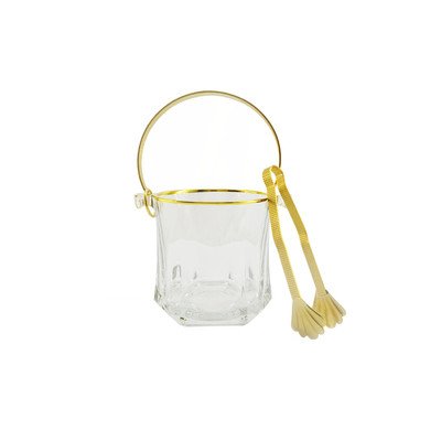 -. Feature : Crystal Clear Glass Ice Bucket / Includes gold plated handle and gold tongs / 100% Lead Free / Materials; Crystal Clear Glass, Gold plated Handle and tongs / Made in Italy.