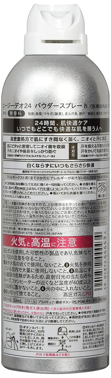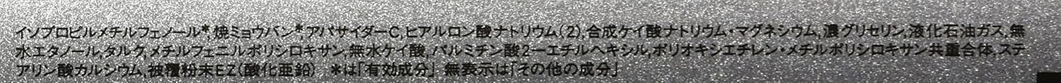 全成分:イソプロピルメチルフェノール*,焼ミョウバン*,アパサイダーC,ヒアルロン酸ナトリウム(2),合成ケイ酸ナトリウム・マグネシウム,濃グリセリン,液化石油ガス,無水エタノール,タルク,メチルフェニルポリシロキサン,無水ケイ酸,パルミチン酸2-エチルヘキシル,ポリオキシエチレン・メチルポリシロキサン共重合体,ステアリン酸カルシウム,被覆粉末EZ(酸化亜鉛)*は「有効成分」無表示は「その他の成分」