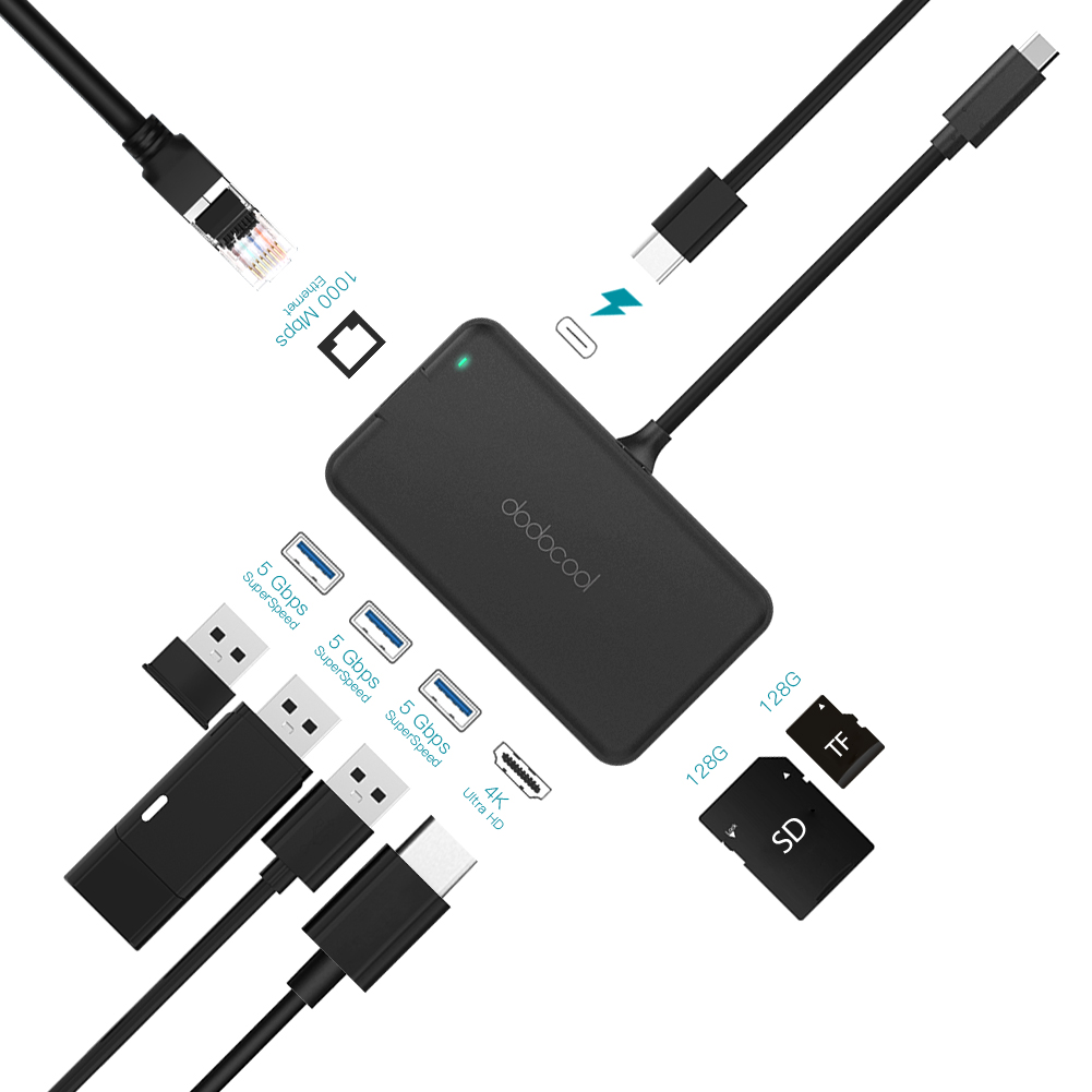 dodocool 8-in-1 Multifunction USB-C Hub with Power Delivery easily adds three USB-A ports, one HD output port, one SuperSpeed Gigabit Ethernet port, one TF card slot, one SD card slot and one USB-C PD (Power Delivery) port to USB Type-C enabled laptops. This stylish, compact device doesn't require an external power supply, so it fits neatly on office tables or in your bag on business trips.