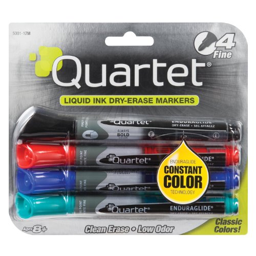 Fine tip marker point is ideal for handwriting or detailed drawings; each pack includes 4 assorted colors: Black, Red, Blue, and Green dry erase markers