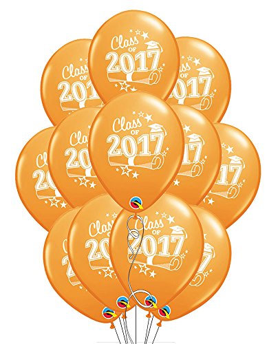 - These orange latex balloons say: "Class of 2017" with a graduation scroll & stars