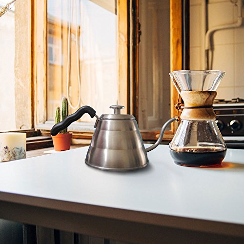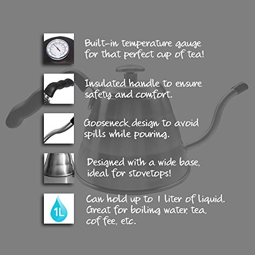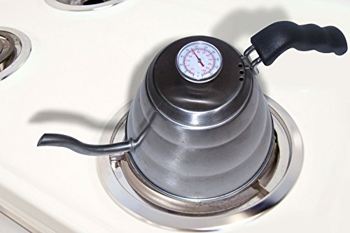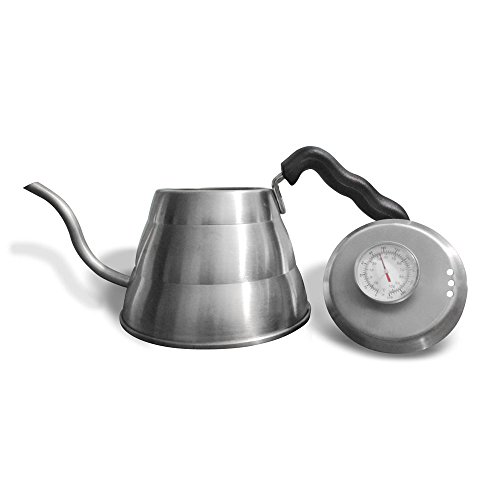 Make the finest barista quality coffee at home with this Gooseneck Kettle with Built-in Thermometer - you can now enjoy the freshest coffee and tea straight from the stove! Made from high quality, lightweight and sturdy stainless steel that will not rust and discolor. It can be used in any variety of heat such as gas, electric, induction or ceramic plates. Its construction is designed in a beehive shape for a quick and even heating process. With an easy to read built-in thermometer to easily brew coffee at its finest quality. Monitor temperature to avoid burning coffee while extracting full consistency of the beans. Also designed with a gooseneck spout to provide a precise pour control. And an ergonomic handle for a comfortable non-slip grip and controlled pouring which is angled and insulated to avoid burning hands.Feature
