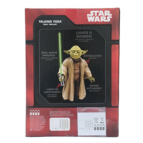 -. Binding : Toy -. Brand : Disney Interactive Studios -. EAN : 0758710328906 -. Feature : Genuine Disney Store Exclusive / Fully articulated, finely detailed sculptured figure / Press button on belly to activate lightsaber, movement and sound / Speaks more than 15 phrases with realistic facial animation / Light-up lightsaber and soft sculptured robe -. IsAdultProduct : 0 -. Label : Disney Store -. Manufacturer : Disney Store -. ProductGroup : Toy -. ProductTypeName : TOYS_AND_GAMES -. Publisher : Disney Store -. Studio : Disney Store -. Title : Yoda Talking Figure - 10'' - Star Wars: The Force Awakens -. UPC : 758710328906