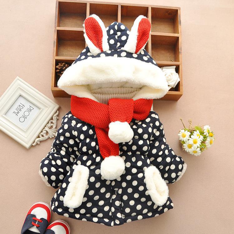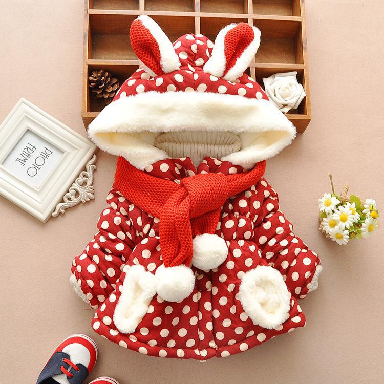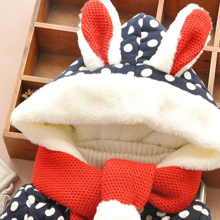 うさぎさんの赤い耳付きフードに、マフラーをセットした女児用コートです。