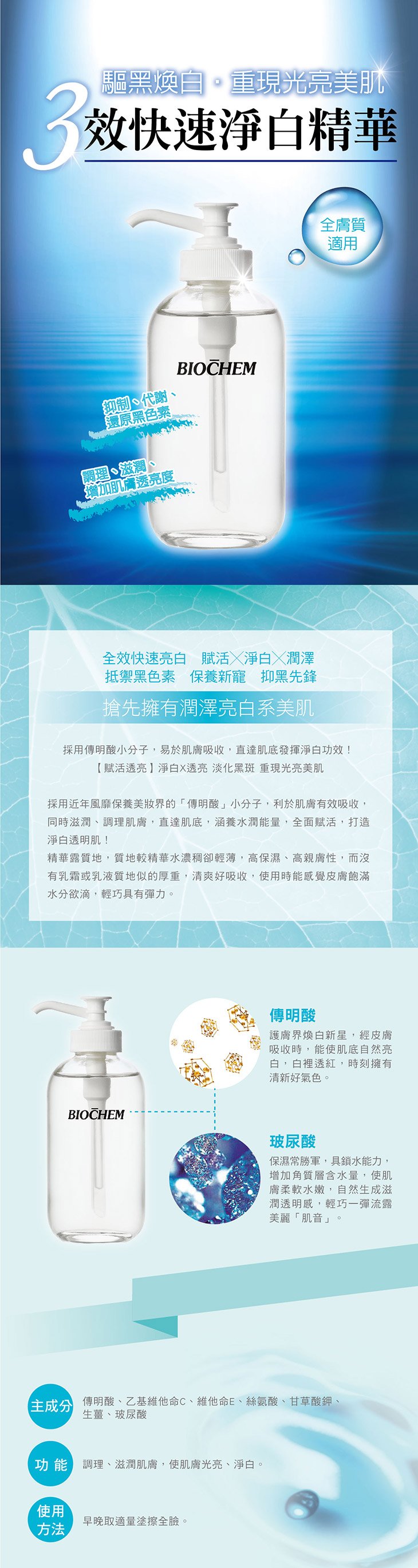 Three-in-one quick whitening essence.Inhibit, metabolize, and reduce melanin. Nurse, moisturize, and brighten the skin. Suitable for: all types of skin.