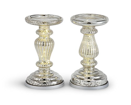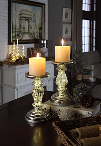 Mercury Glass Table Decor Accents, XY Decor Set of 2 8.5" Lit Pillar Candle Holder with Timer for Home and Church Decoration - Silver