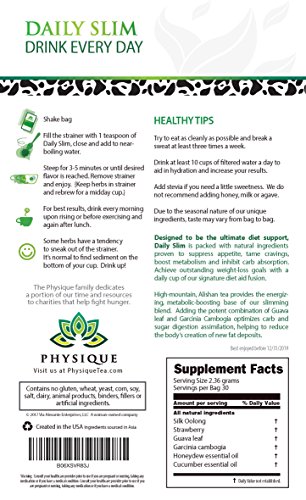 Studio : Physique Tea Publisher : Physique Tea Binding : Health and Beauty Product Description Designed to be the ultimate diet support, Daily Slim is packed with natural ingredients proven to suppress appetite, tame cravings, boost metabolism, and inhibit cab absorption. Achieve outstanding weight-loss goals with a daily cup of our signature diet aid fusion. High- mountain, Alishan tea leaves provide the energizing, metabolic boosting base of our slimming blend. Adding the potent combination of Guava leaf and Garcinia Cambogia optimizes carb and sugar digestion assimilation, helping to reduce the body's creation of new fat deposits. 0