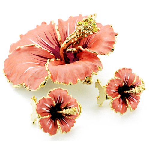 -. Title : Peach Hawaiian Hibiscus Swarovski Crystal Flower Pin Brooch And Earrings Gift Set