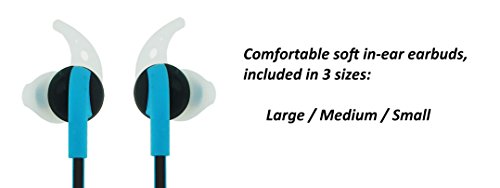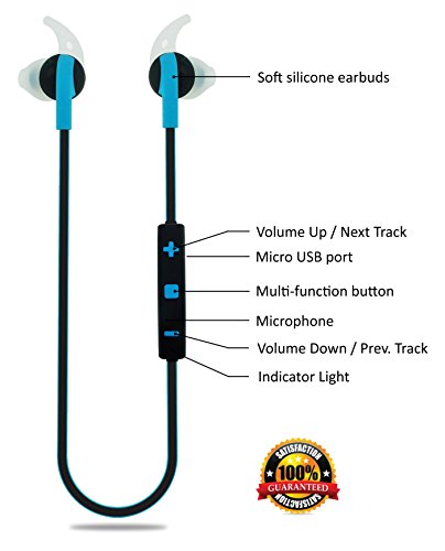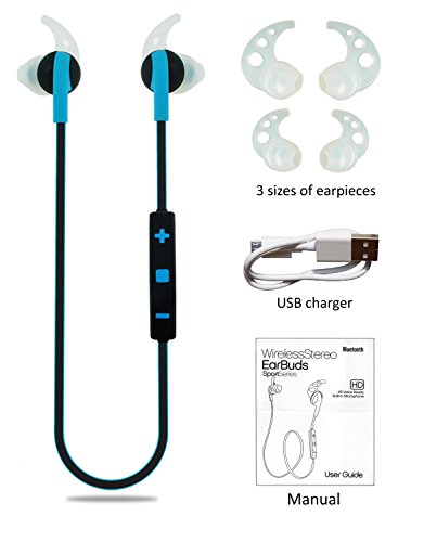 -. Feature : ENJOY YOUR FAVORITE MUSIC in high-fidelity stereo sound. Our noise reducing earbuds insure clear and perfect quality. Powerful bass enhances your listening experience. The perfect gift for someone who relishes fine music. The 50 foot range of the earbuds from the phone allows their use even when just relaxing at home! / TAKE PHONE CALLS QUICKLY AND EASILY without interrupting your exercise program by simply pressing a single button to pause music and instantly provide a clear channel for communication. The earphones have a high-quality lithium rechargeable battery providing 7 hours of music and talk time, 180 hours of standby time, and can be charged in 1 hour with the USB cable provided. / ENHANCE YOUR COMFORT WITH PERFECTLY FITTED EARBUDS that stay securely in your ears even during the most rigorous exercise. The lightweight, soft silicone butterfly earpieces come in 3 sizes for easy ear canal fitting for comfortable flexibility and wearability. / EASY ACCESS TO VOLUME CONTROLS AND MICROPHONE on the cord between the earbuds by your neck. Most other earbuds require you to adjust volume on the earbud in your ear which is inconvenient and difficult. The easily accessible + & - button on ours controls both music and phone volume and allows you to skip and replay music tracks and take phone calls very simply. / COMPLETELY COMPATIBLE WITH VIRTUALLY ALL SMARTPHONES via advanced Bluetooth 4.1 technology. Easy and fast pairing with all iPhone, Samsung, Note 3, Nexus, Motorola, HTC, LG, Nokia, Android and most other phones. Clear and comprehensive instructions for pairing with up to 2 phones at the same time are included.