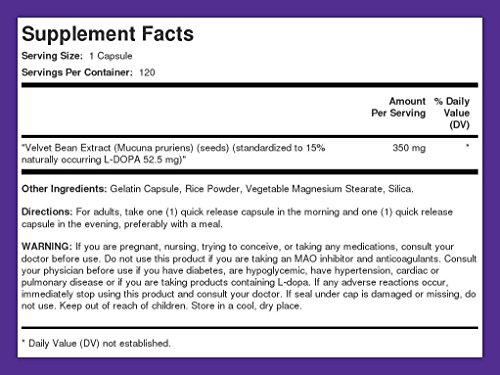 CONTAINS 15% L-DOPA. NATURAL FIBER IN CAPSULE FORM. A DIET AND MOOD SUPPORT. STANDARDIZED VELVET BEAN EXTRACT.