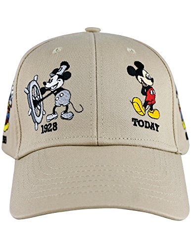 Embroidered images encircle the khaki 100% cotton cap, depicting cartoon Mickey and his evolution over the decades.
