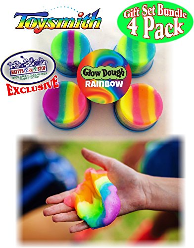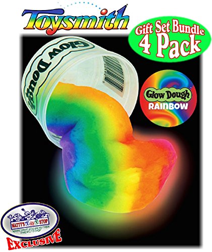 Toysmith Glow Dough Rainbow (Slime/Putty) Complete Gift Set Party Bundle with Exclusive "Matty's Toy Stop" Storage Bag - 4 Pack, is AWESOME! Includes All 4 Color Combinations of Toysmith Glow Dough Rainbow! Expose Glow Dough to a light source and then see how it glows in the dark. In just a few seconds Glow Dough is ready to glow and stretch the imagination! Each Glow Dough Rainbow comes packaged in resealable 3-inch x 1.75-inch container for easy transport and convenient storage. Makes a great gift & is perfect for schools, party favors, stocking stuffers, baskets, special needs, promotions and so much more! For Ages 5 and up - Fun for the whole family! - Glow Dough will not stain furniture or carpets.Feature