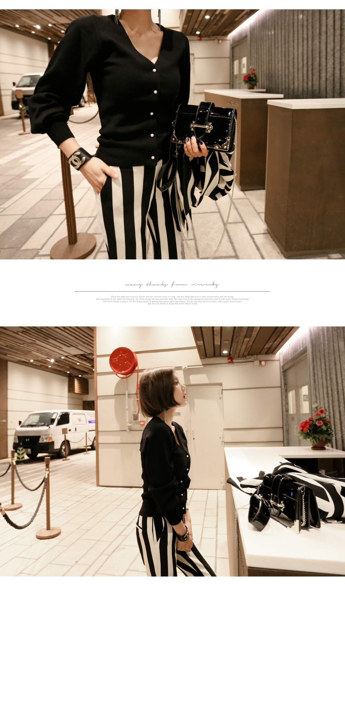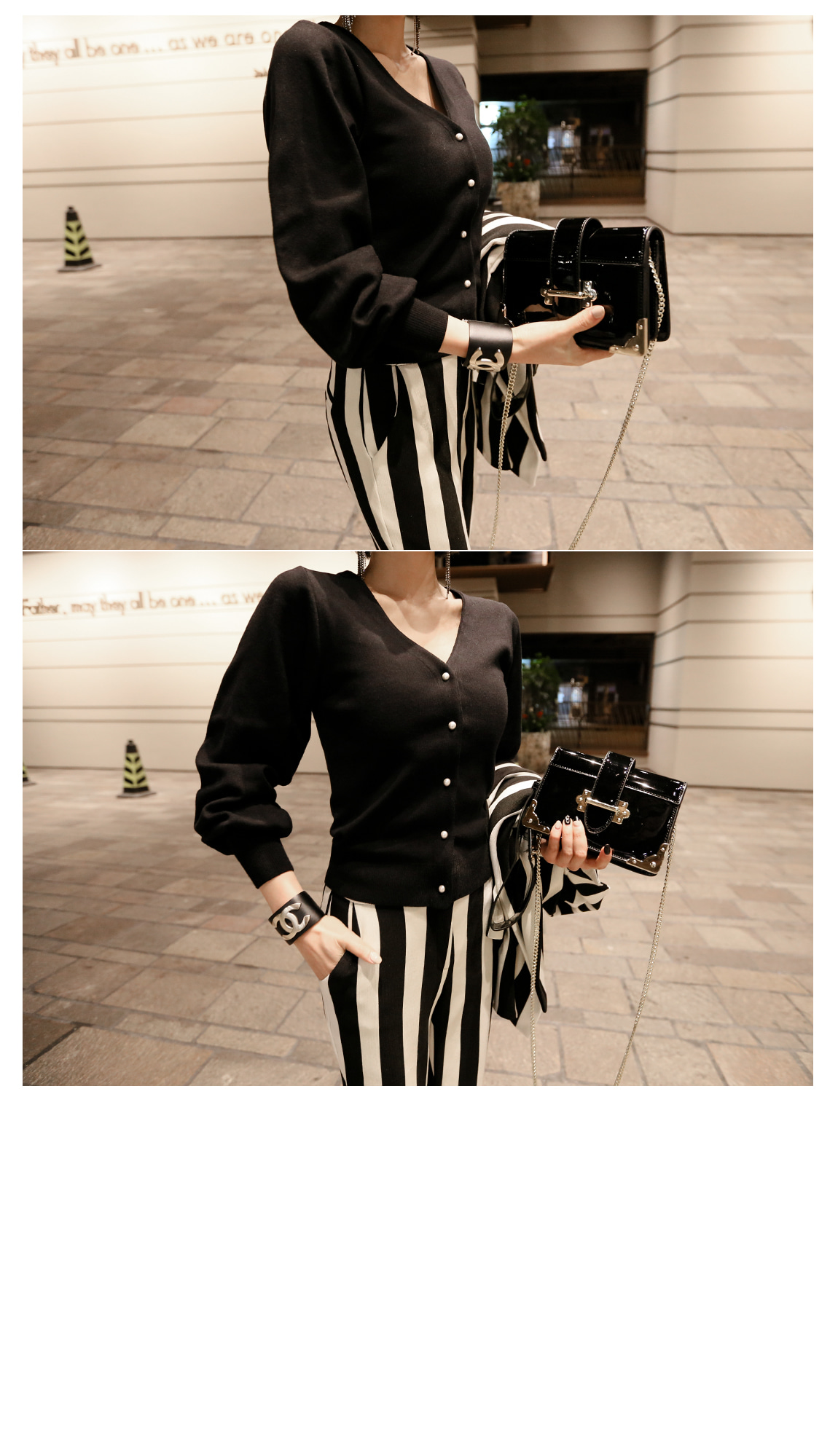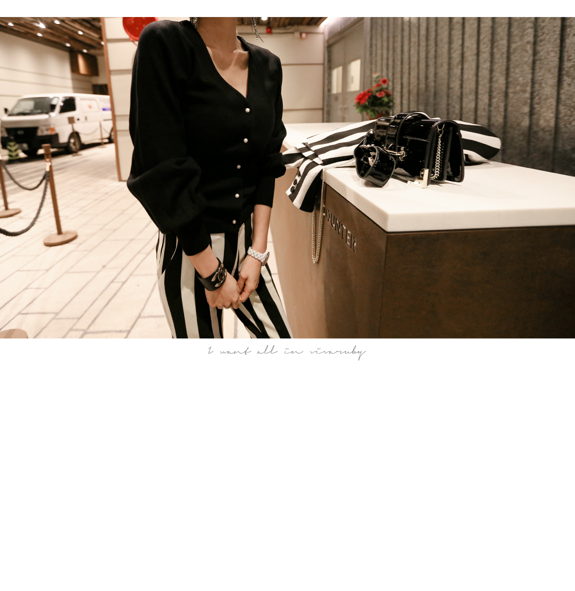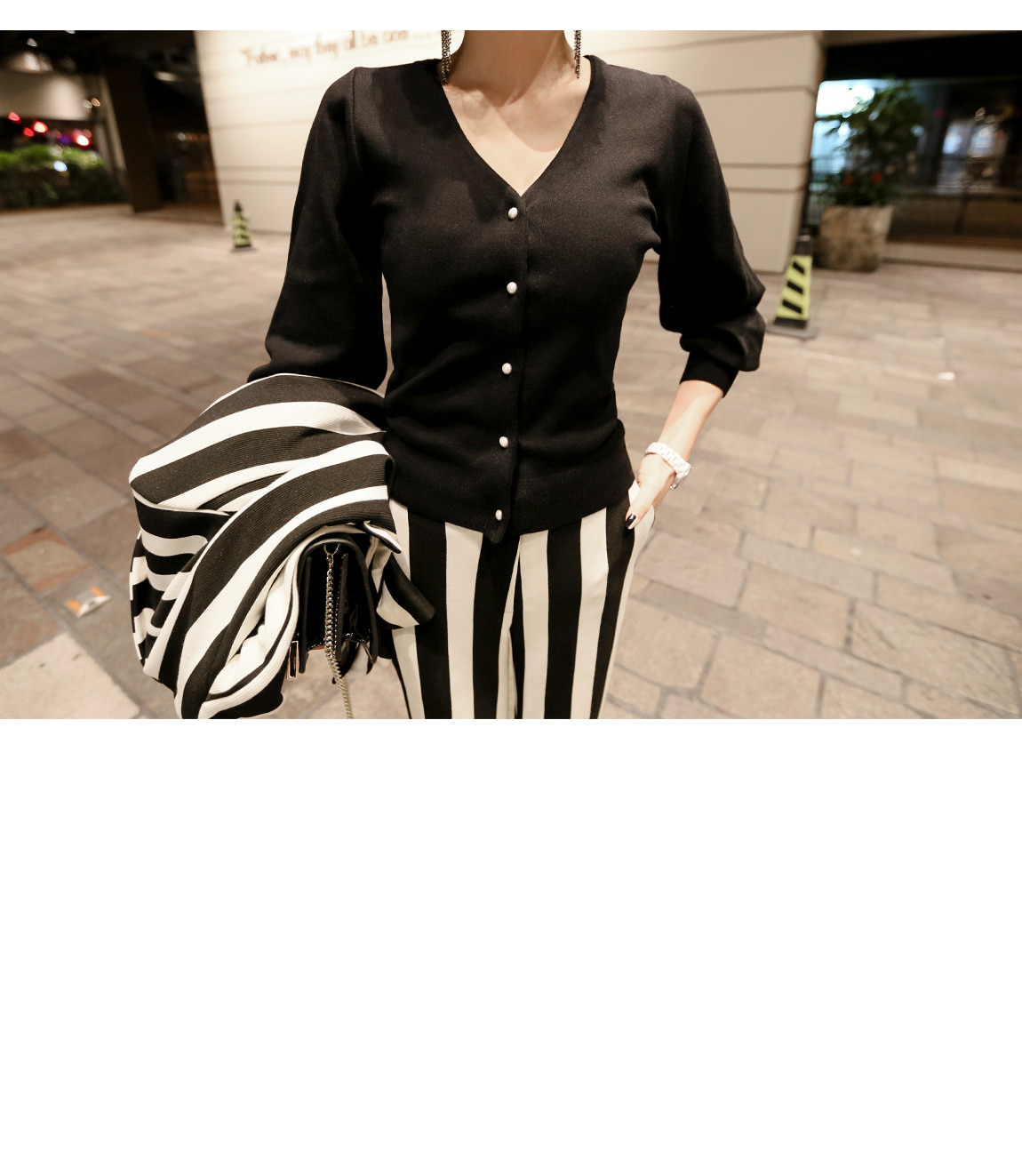 シンプルなV衿ぐりに晋州ボタンでポイントを与え、