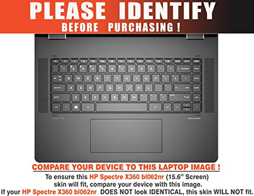 -. Feature : Made for the HP Spectre x360 Convertible 15-bl062nr (15.6" Screen) laptop only. Device NOT included. / Please refer to the "Identify" image on this listing to ensure this skin will fit your device. / Durable, high quality adhesive vinyl stickers; this product is NOT A HARD COVER or made of rubber, silicone, gel, or plastic. / Image colors may vary depending on your monitor settings. / Easy to apply without any liquids / solution. To remove, simply peel it off slowly with your bare hands, leaving behind no sticky residue!