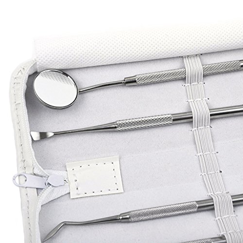 This 4 piece tarter scraper and remover set includes: 1 scraper, 2 scaler, 3 mirror, 4 probe. Each measures 6.81" long.