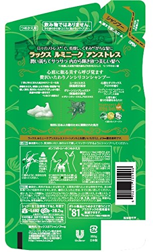 "350g Refill Lux Ruminiku unstressed non-silicon shampoo" is from the hair without gloss in the day-to-day external stress is a non-silicon shampoo that leads to hair that shoots shine from the inside and smooth full of moisture. Non-silicon shampoo of creamy foam holding the friction except gently such as dust sebum by the environment. Eucalyptus extract (moisturizer) Green Complex (moisturizer) green tea extract aloe extract combination. Heart meet relaxing aroma. Refill. Not used when there is an abnormality in the Note ● scalp also when an abnormality appeared discontinue use and recommended to consult dermatologist.