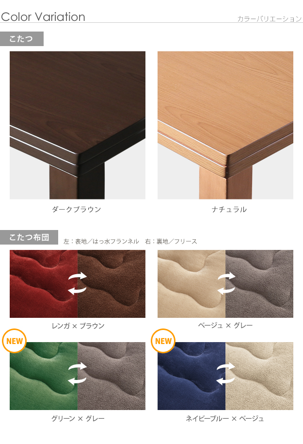 ●材質:こたつ天板-繊維板・UV塗装(オーク柄木目転写)、こたつ脚部-天然木(ラバーウッド)、布団表地-ポリエステル100%(撥水フランネル)、布団裏地-ポリエステル100%(フリース)、中綿-ポリエステル100%
