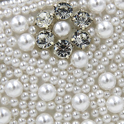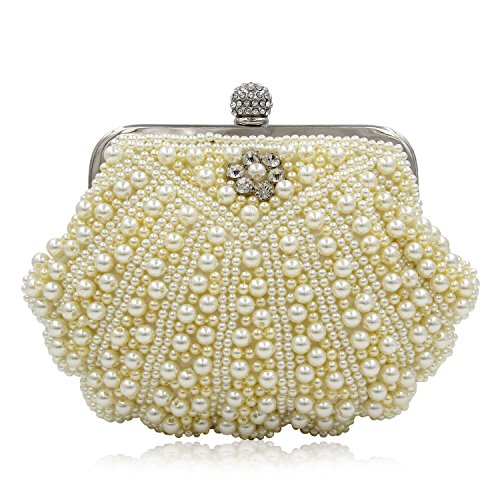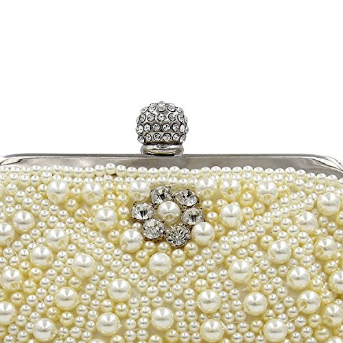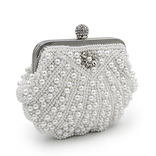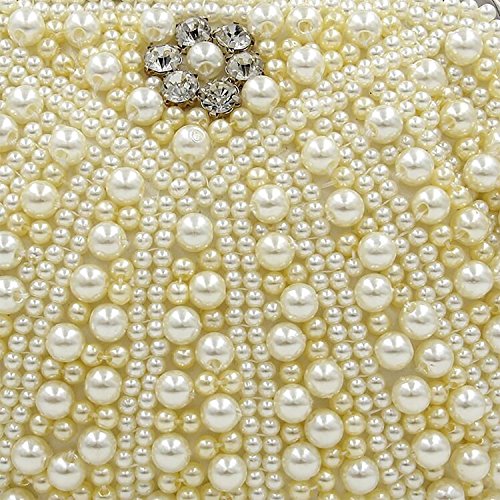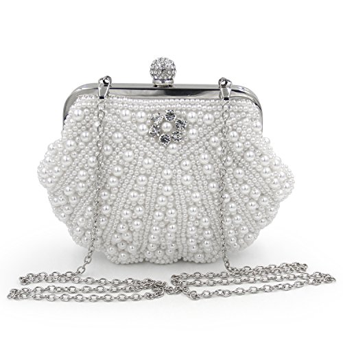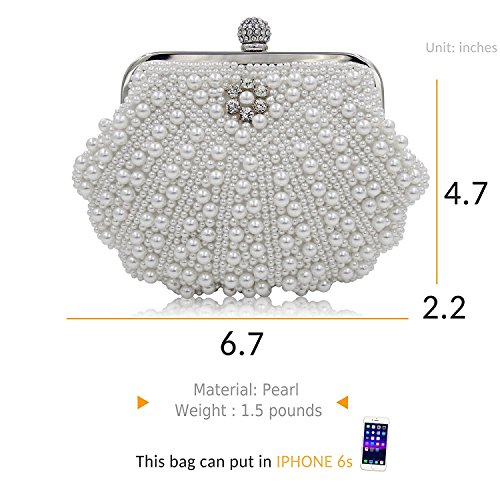 -. Feature : -STYLE-: Pearl Bridal Clutch Bag With Metal Shoulder Chain / -MATERIALl-: White Pearls Crystals. All the Pearl and Crystals are covered By Handmade. So it would be a little irregular. It is not a quality problem. / CLOSURE: Hasp style Closure With Full Of Shinning Rhinestones. Back side is Pure Black Stain. / DIMENSION: It fits in IPhone5s, Cash, Lipstick, Small Cosmetics, Keys. / OCCASION : Wedding, Party, Cocktail Ceremony, Daily, Dating