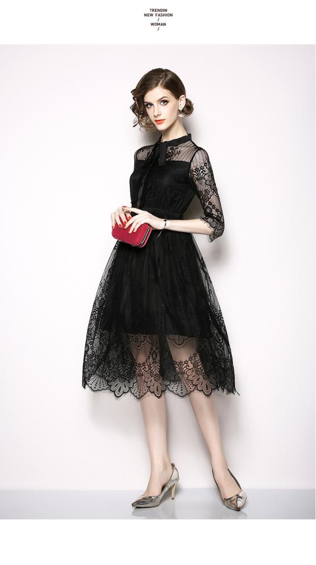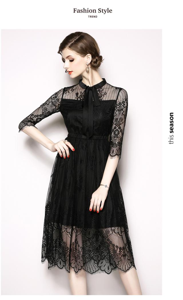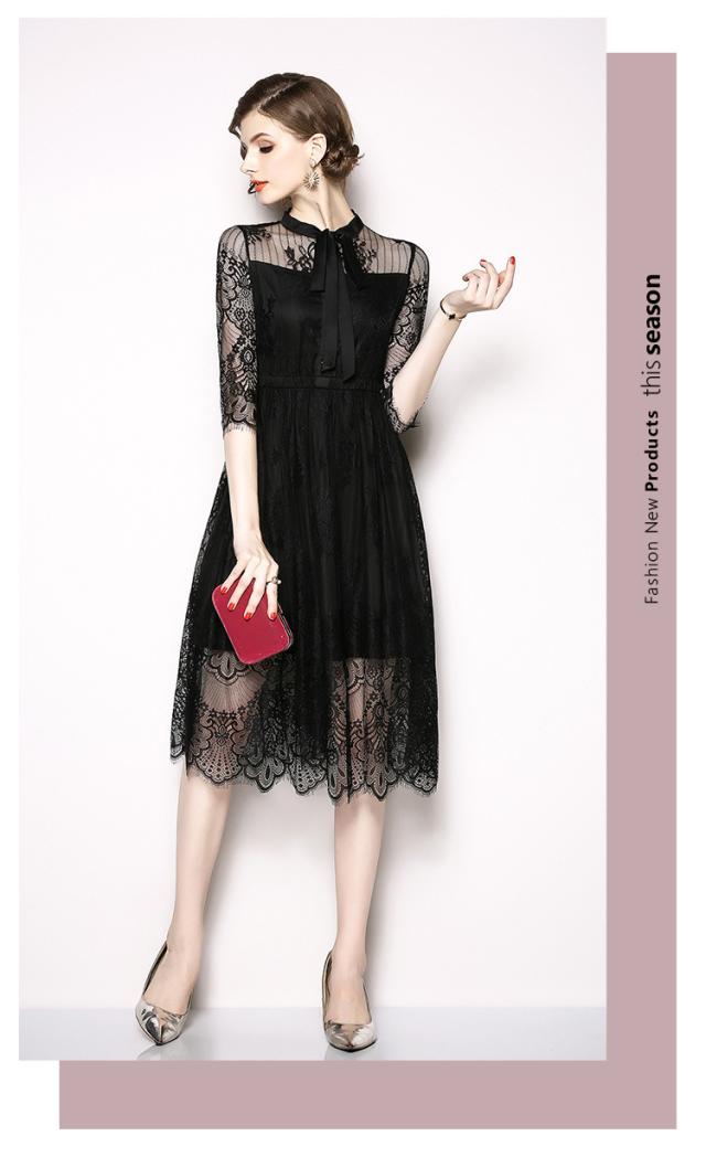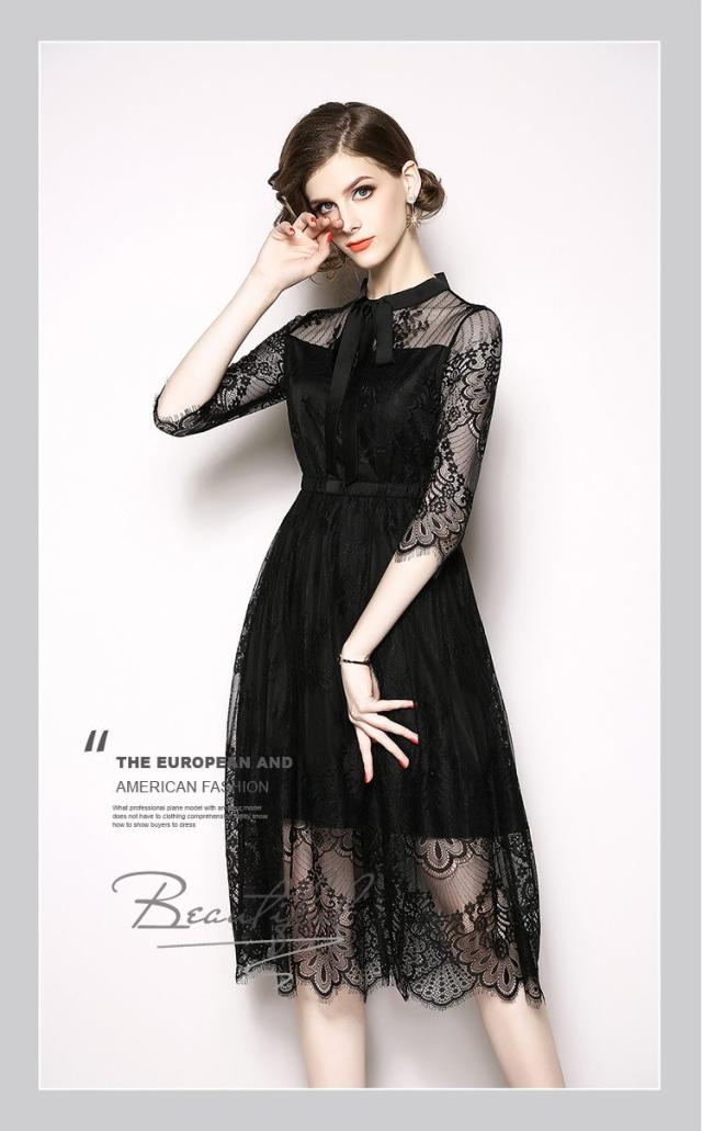 レース 刺繍 スタンドカラー 七分丈 膝丈 りぼん ドレス ワンピース 結婚式 二次会 パーティー ディナー 女子会 卒業式 謝恩会 コンサート