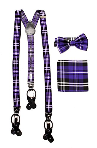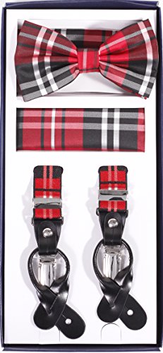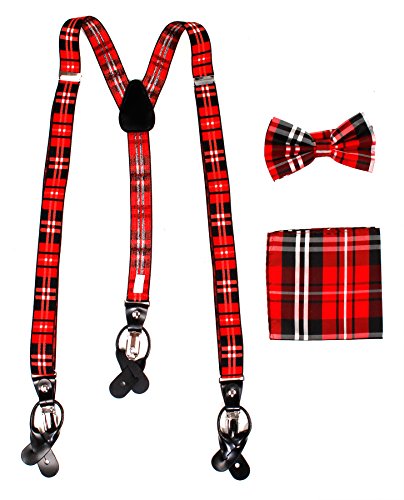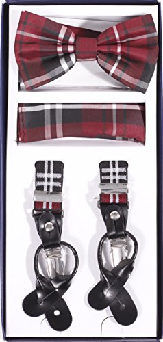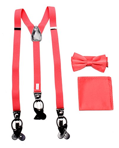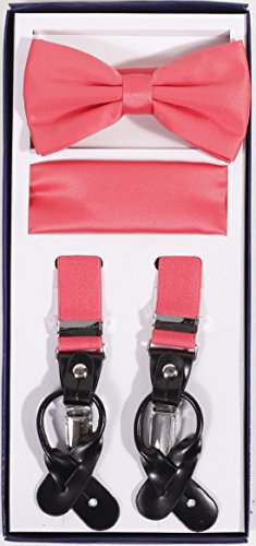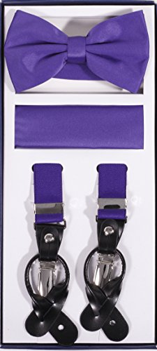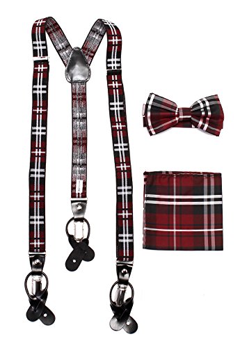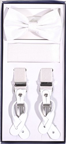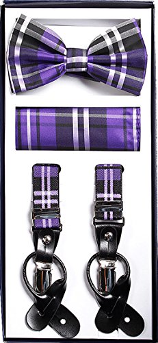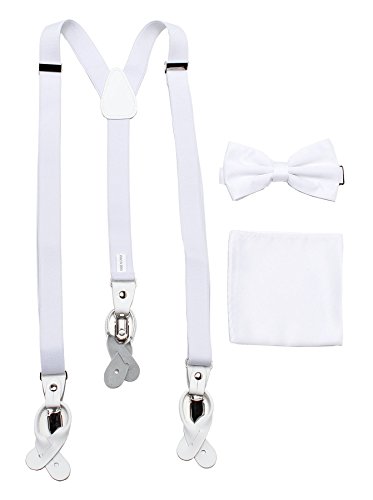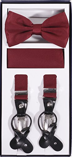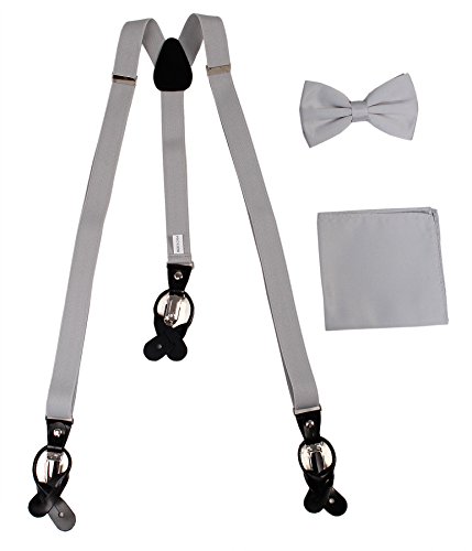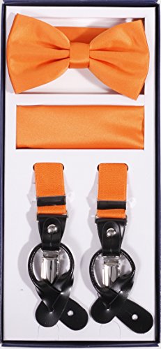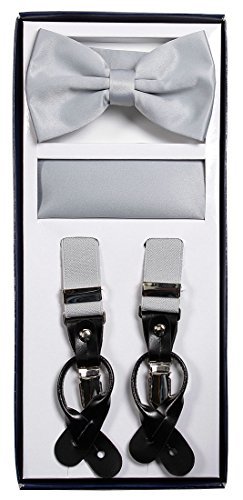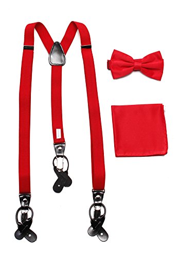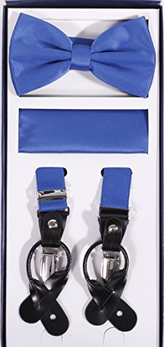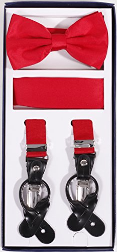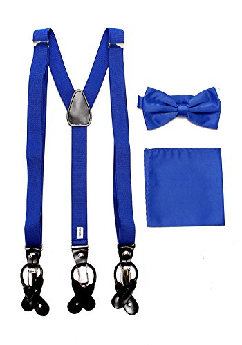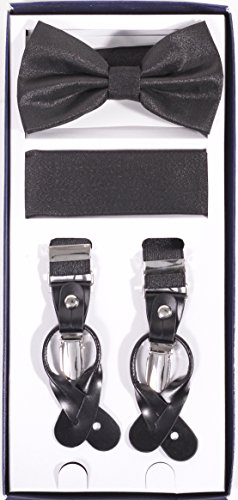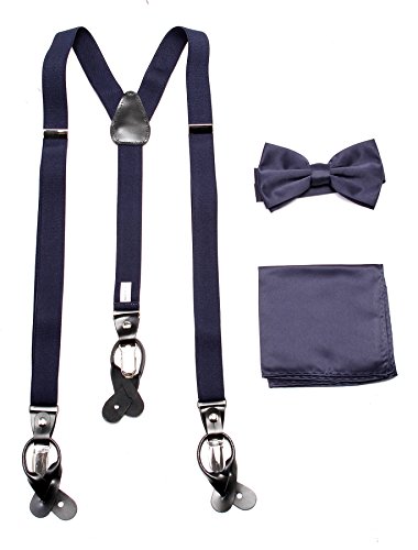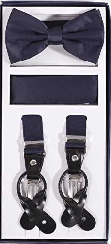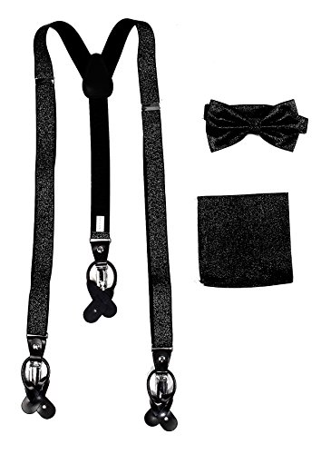 Studio : Vesuvio Napoli Publisher : Vesuvio Napoli Product Description This is a brand new?Vesuvio Napoli?brand Beautiful Y-shaped back Skinny?Suspender Combo?that will match any shirt and pants. Great looking suspender which can be worn with buttons or the metal silver-tone clips braces. The suspender has 3 clips and 2 length adjusters.? The box includes 6 buttons, matching bow tie and hanky. The elegant design makes this a perfect men's or women's suspender to wear with a suit for work, special event, or with casual attire such as jeans. It is easy to connect to trousers with the clips or you can use the buttons. If your pants do not have the buttons, you can use the 6 buttons provided to sew on buttons to your trousers. It is easy to connect to trousers with the clips or you can use the buttons. If your pants do not have the buttons, you can use the 6 buttons provided to sew on buttons to your trousers. The material is elastic with leather end pieces. The width of the suspender is?2.54 cm?(approximately?1 inch). The length is adjustable from?65 cm (25.5 inches)?to?100 cm (39.5 inches)?laid out naturally and un-stretched. We have more variety of suspenders. Check out our other collection of suspender sets in various colors. 0