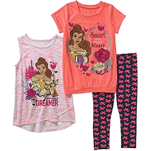 Instantly expand your little one's warm-weather wardrobe with this girls' 3-piece outfit set featuring Belle, the Disney Princess from the popular animated film Beauty and the Beast. A short-sleeve tee, a tank top and a coordinating pair of leggings are all included in the set for great value. The tops have stylish Belle graphics on the front, while the leggings have a colorful heart pattern all over and a hassle-free covered elastic waistband. This officially licensed Belle outfit set makes a great gift for young Disney fans. Wash inside out, machine wash cold with like colors, gentle cycle, do not bleach, tumble dry low, low iron on reverse if needed, do not iron printFeature