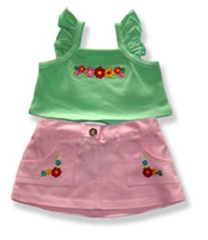 -. Binding : Toy -. Brand : The Bear Mill -. Color : Green, Pink -. EAN : 0611265006074 -. Feature : fits 15 inch plush / green tank top with flower embelishments / pink skirt / flowr embelishments / 2 piece outfit -. Label : The Bear Mill -. Manufacturer : The Bear Mill -. Model : 6061 -. MPN : 6061 -. PackageQuantity : 1 -. PartNumber : 6061 -. ProductGroup : Toy -. ProductTypeName : TOYS_AND_GAMES -. Publisher : The Bear Mill -. Studio : The Bear Mill -. Title : Green Top and Pink Skirt - 6061 Fits 15" - 16" bears, includes Build a Bear, The Bear Mill, and Stuff your own Animals. -. UPC : 611265006074
