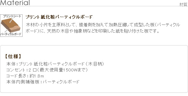 材質:本体-プリント紙化粧パーティクルボード(木目柄)、本体内側補強板-パーティクルボード、コンセント-2口合計1500W・コード長1.8m