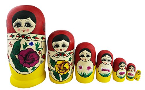 -. Feature : Traditional russian dolls:matryoshka nesting dolls / Contains 7 dolls,stack into one another to appear as one / Little girl with long eyelash and beautiful rose flower pattern / It's wooden and handmade,so every one is unique / Perfect for kids toy and special home decoration