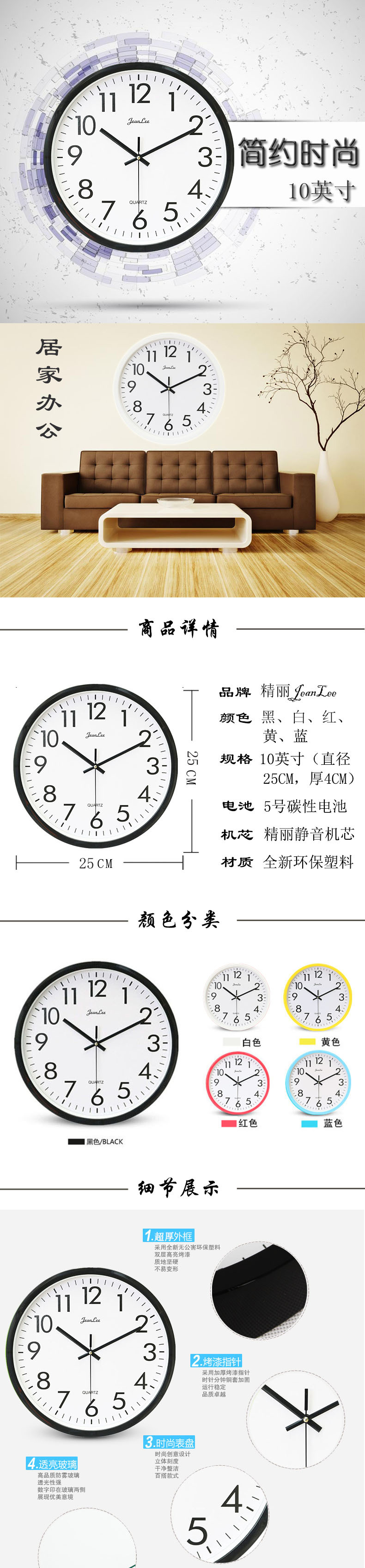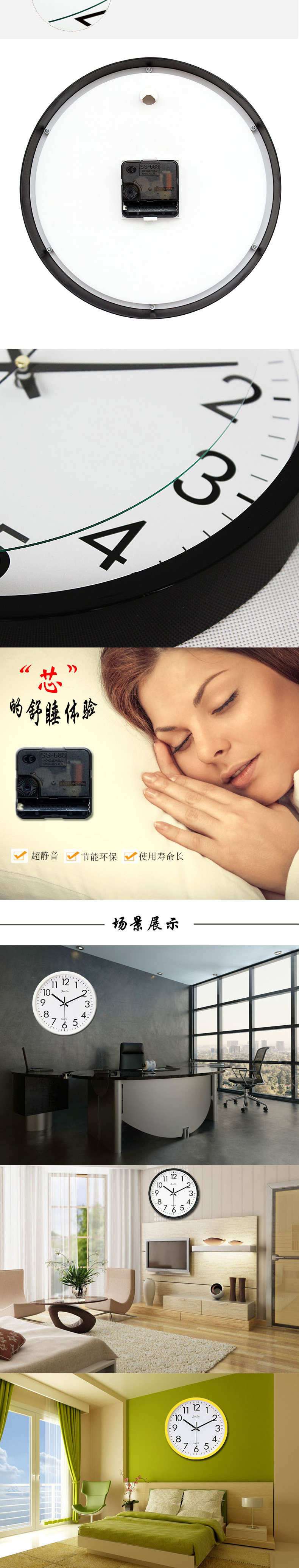 高档机芯配置,准确无声,适合卧室使用,不影响睡眠;同时也适合书房使用,不影响阅读。电池放在时钟的背面,不影响美观,需要自备一节5号电池。颜色鲜艳靓丽,背面安装有挂口,方便悬挂在墙上,也方便移动时钟的位置。玻璃钟面,透明清晰,环保防尘,易擦洗