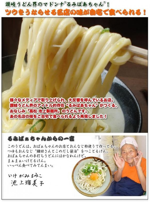 様々なメディアで取り上げられ、大反響を呼んでいるお店。讃岐うどん界のアイドル的存在「るみばあちゃん」がつくる、おなじみ「高松 池上製麺所」のうどんをお取り寄せで再現!! |