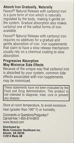 -. Binding : Misc. -. Brand : Feosol -. EAN : 0346017096606 -. Feature : Feosol natural release with carbonyl iron is a pure form of iron which is naturally regulated by the body, making it gentle on the system / Gradual absorption also makes carbonyl one of the safest forms of iron available / Common side effects associated with iron supplements may be minimized -. Label : Feosol -. LegalDisclaimer : Statements made, or products sold through this web site, have not been evaluated by the Food and Drug Administration. They are not intended to diagnose, treat, cure, or prevent any diseases. Consult a qualified health care practitioner before taking any substance for medicinal purposes.California Proposition 65 WARNING: Some products on this store contains progesterone, a chemical known to the State of California to cause cancer. Consult with your physician before using this product. -. Manufacturer : Feosol -. PackageQuantity : 3 -. ProductGroup : Grocery -. ProductTypeName : GROCERY -. Publisher : Feosol -. Studio : Feosol -. Title : Feosol Carbonyl Iron Supplement , 60 CT (Pack of 3) -. UPC : 346017096606