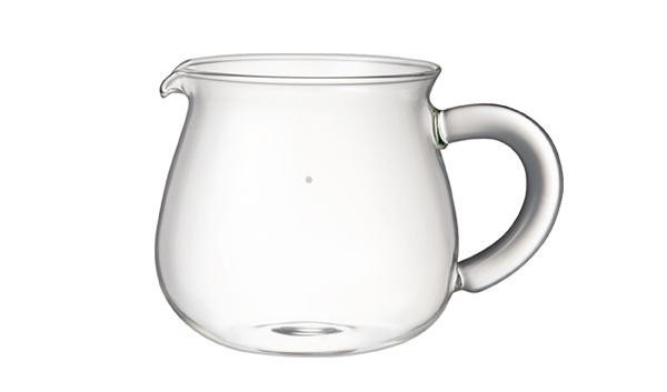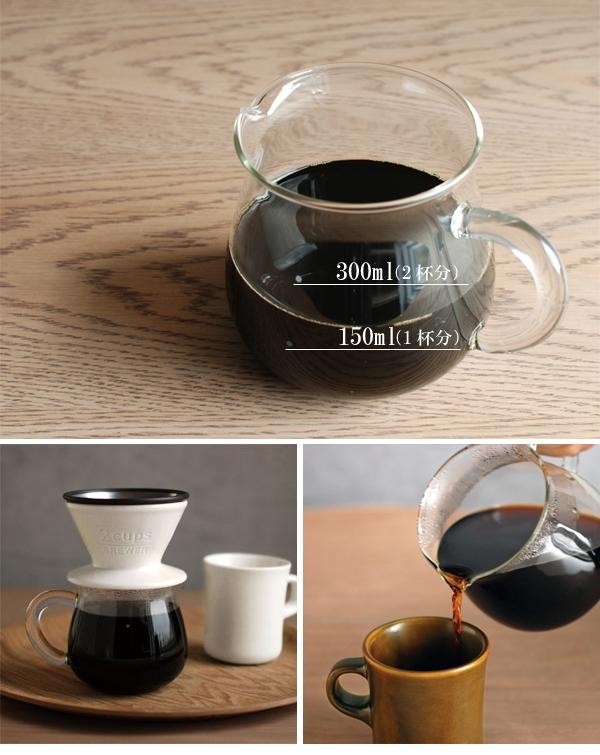 | 別売の磁器製ブリューワー(SCS-02-BR)や、プラスチック製ブリューワー(SCS-02-BR-CGY)をセットしてドリップします。耐熱ガラス製で透明なので、ドリップの様子を見ることができます。デザインを損なわないシンプルな容量の目盛り(白いドット)が付いています。 |