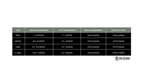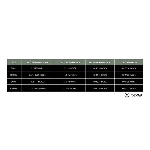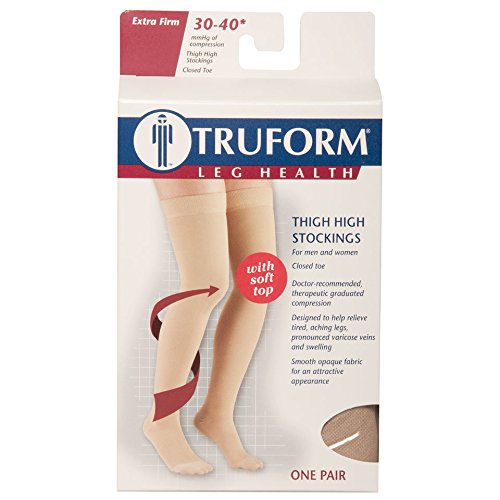 -. Feature : Truform model 8846, extra-firm strength, thigh length, five intervals of 30-40 mmHg therapeutic graduated compression, doctor-recommended for tired heavy aching legs, helps treat spider veins, varicose veins, and swelling of the legs and feet / Generous closed toe area and knit-in, defined heel for added durability and proper fit, toes are comfortable, and the heel cushioning won't wear thin / Soft top band around the thigh designed for wearing comfort, flexible but snug fit ensures stocking remains in place throughout the day without constricting the leg, garter belt should be used when standing for prolonged periods / Concealing smooth-knit durable opaque fabric texture, completely latex-free, classic fit, medical grade support for severe leg health symp / Made in the USA and manufactured to FDA specifications using 83% nylon and 17% spandex